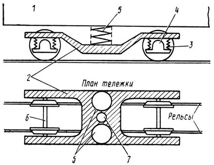 1 – кузов; 2 – рамы тележек; 3 – рессорные комплекты; 4 – буксы; 5 – центральный рессорный комплект; 6 – колесные пары; 7 – шкворневое устройство