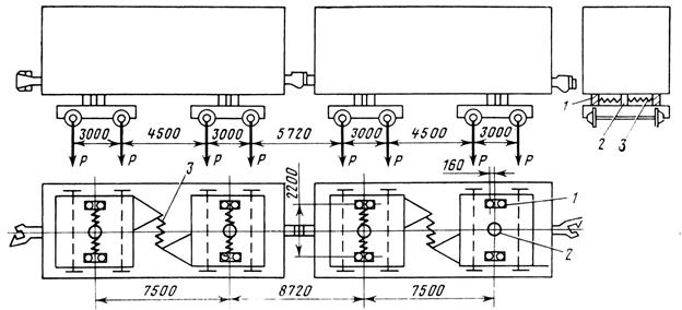 опоры по одной на тележку (шкворни); 3 – упругая связь между тележками (сочленение)