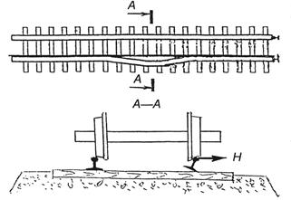 Под следующей «шальной» тележкой наклон рельса облегчается (костыли уже частично наддернуты), и при таких же боковых силах Н костыли еще более наддергиваются. Когда нет снега и костыли видны, их периодически добивают, а зимой, как правило, такие добивки не делают. Поэтому весной путейцы обнаруживают, что внутренние костыли (пришивочные) сплошь наддернуты (при отсутствии противораспорных подкладок), особенно на тормозных участках. Это результат многократного прохода «шальных» тележек.