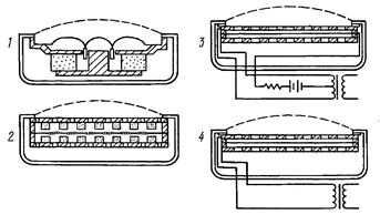В телефонах, в основном, применяются электромагнитные преобразователи, а также электродинамические, электростатические, и угольные. На рис. 5.4 показаны варианты конструкций телефонов: 1 — электродинамического с сосредоточенной звуковой катушкой; 2 — электродинамического с распределенной звуковой катушкой; 3 — электростатического; 4 — электретного (близкого по конструкции к конденсаторному). Катушку в электродинамических преобразователях телефонов выполняют либо в традиционной форме, когда она намотана проводом на каркас, либо в варианте, в котором она состоит из концентрических плоских колец, напыленных или нанесенных другим методом на плоскую диафрагму.