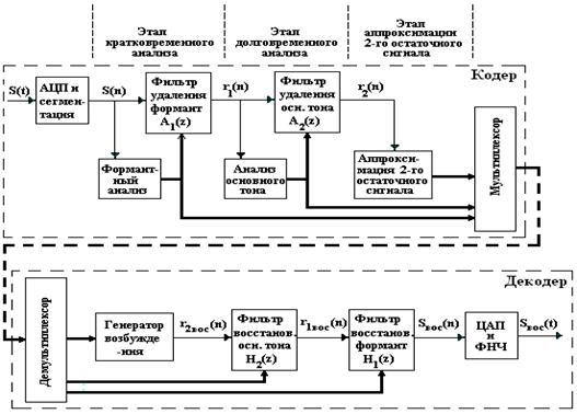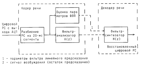 Процедура декодирования речи заключается в пропускании принятого сигнала возбуждения через синтезирующий фильтр известной структуры, параметры которого переданы одновременно с сигналом возбуждения. Сигнал на вход анализирующего фильтра поступает непосредственно с выхода АЦП, а выходной сигнал синтезирующего фильтра попадает на вход ЦАП. Приведенное описание процессов кодирования и декодирования речи не является исчерпывающим, оно объясняет лишь принцип действия кодека. Практические схемы заметно сложнее, и это связано в основном со следующими двумя моментами.