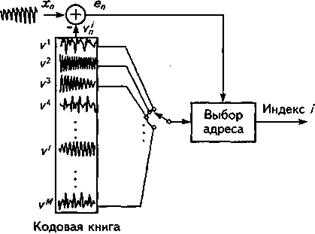 В 1984 году, как естественное развитие многоимпульсного метода возбуждения, было предложено так называемое векторное кодирование (VQ), когда кодируется одновременно группа параметров, характеризующих позиции импульсов и их амплитуды. В этом случае в качестве сигнала возбуждения используется последовательность отсчетов (т.е. “ вектор ”), взятая из заданного набора этих последовательностей (т.е. из “ кодовой книги векторов ”). Входной вектор, представляющий собой образец входного РС, сравнивается с векторами, находящимися в кодовой книге, и находится вектор, наиболее близкий к входному. Критерием выбора вектора часто становится минимизация среднеквадратичной ошибки между образцом входного сигнала и вектором. Каждому “вектору” из этой “книги” соответствует свой адрес - индекс (номер), который и передается по каналу связи на приемную сторону. На рис. 12.2 изображен процесс кодирования. На приемной стороне в декодере используется точно такая же кодовая книга, из которой по индексу извлекается требуемый вектор. Таким образом, снижение скорости в результате использования VQ достигается путем передачи на прием только номера (индекса) вектора с масштабным коэффициентом.