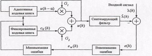 Очевидно, что сначала определяются параметры фильтра, а затем уже находятся индексы кодовых книг а и k и соответствующие коэффициенты усиления G1 и G2. Параметры кодовых книг выбираются так, чтобы минимизировать взвешенную ошибку между исходным речевым сигналом S(n) и восстановленным Ŝ(n), что достигается подачей содержимого каждой «ячейки» кодовой книги на синтезирующий фильтр с целью выявления максимально похожего (по восприятию) образца.