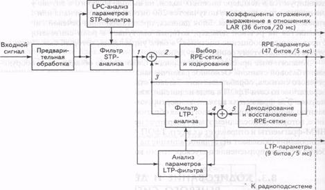 Блок предварительной обработки кодера осуществляет предыскажение входного сигнала при помощи цифрового фильтра восприятия, подчеркивающего верхние частоты, нарезание сигнала на сегменты по 160 выборок (20 миллисекунд) и взвешивание каждого из сегментов окном Хэмминга. Сигнал с выхода фильтра предыскажений подвергается анализу в соответствии с методом линейного предсказания, в результате чего определяются коэффициенты кратковременного линейного предсказания(STP). Полученные параметры, представляющие собой восемь коэффициентов отражения STP -фильтра, преобразуются в логарифмические отношения площадей (LAR), которые могут быть представлены более компактно, нежели сами коэффициенты отражения. Значения LAR в цифровой форме представляются 36 битами.