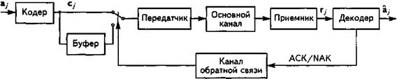 Рис. 17.3. Система передачи данных с повтором блоков и каналом обратной связи