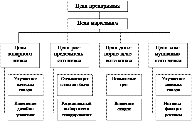 Систематизация, упорядочение целей маркетинга могут осуществляться путем разработки дерева целей маркетинга, которое включает цели, задачи, мероприятия для их достижения, согласованные с субъектами маркетинговой системы. Дерево целей позволяет детализировать общие цели, оценить наиболее значимые для конкретной ситуации цели, определить комплекс задач и наметить маркетинговые мероприятия для их решения.