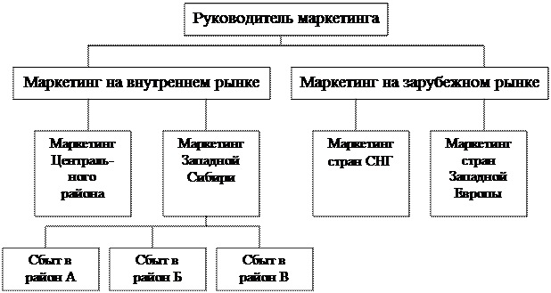Региональная организационная структура маркетинга применяется для предприятия, имеющих большой ареал сбыта, когда товар распределяется в регионы с различными требованиями. В рамках этой структуры специалисты по маркетингу группируются по отдельным регионам, представляющим части общего рынка. Ответственность за организацию маркетинга возлагается на менеджера по конкретному рынку. Он координирует все маркетинговые мероприятия по всем продуктам и осуществляет контроль за всеми покупателями, которые находятся в его регионе.