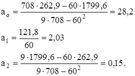 Рассчитаем параметры уравнения ао, а1, а2 по формулам (4.16), (4.17), (4.18).