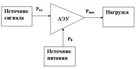 Рассмотрим общую структурную схему АЭУ, которая приведена на рис.2.1. В состав аналоговых электронных устройств входит широкий класс усилителей. Усилителем называется устройство, управляющее передачей усиленной энергии от источника питания в нагрузку. Другими словами, усиление сигнала представляет собой процесс преобразования энергии источника питания в результате воздействия на него усиливаемого сигнала через усилительный элемент. Усиливаемый сигнал с незначительной мощностью Рвых управляет мощностью источника питания Ро, отдавая часть этой энергии Рвых в нагрузку.