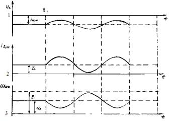 Рис.3.4. Графики напряжений и токов в цепях усилителя: 1 – на управляющем электроде; 2- ток в выходной цепи; 3 – напряжения в выходной цепи.