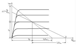 С помощью нагрузочной прямой по постоянному току определяют рабочую точку в выходной цепи. Рабочая точка определяется как точка пересечения найденной нагрузочной прямой со статической характеристикой, соответствующей заданному смещению на управляющем электроде. Опустив перпендикуляры из рабочей точки на вертикальную и горизонтальную оси, находят постоянные составляющие тока