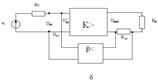 различают обратную связь по напряжению и по току. В структурной схеме, приведенной на рис.13.1,а, напряжение обратной связи снимается непосредственно с нагрузки и пропорционально выходному напряжению. Такая обратная связь называется обратной связью по напряжению. Если напряжение обратной связи снимается с дополнительного сопротивления, рис. 13.1,б, включенного последовательно