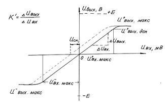 В рабочем диапазоне амплитудная характеристика линейна и определяет область усиления. Наклон характеристики в этой области определяется собственным коэффициентом усиления К'= DUвых /DUвx.