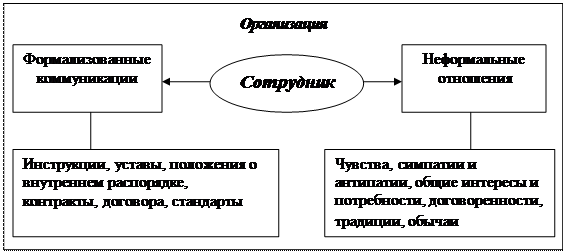 Из рис. видно, что порядок служебных отношений определяется инструкциями, положениями о внутреннем распорядке, установившимися порядками, подписанными контрактами, договоренностями и регламентами. Порядок неформальных отношений определяется чувствами людей друг к другу, симпатиями и антипатиями, общими интересами и потребностями, договоренностями и традициями.