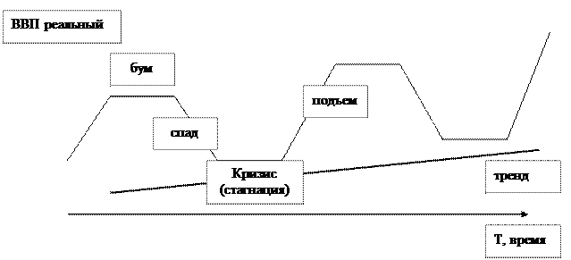 | Кризис (стагнация) | Минимальный объем производства, инвестиционного и потребительского спроса. Сохраняется массовая безработица, банкротство фирм. |