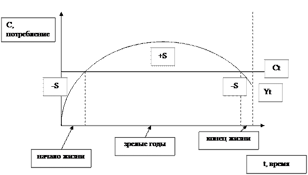Смысл гипотезы состоит в том, что жизненный цикл человека условно делится на «начало жизни» (детство и ранняя молодость человека), «зрелые годы» (экономическая активность человека) и «конец жизни» (пенсионное состояние человека). В первый период жизни человек не получает доход – живет за счет родителей. То есть присутствует только потребление, сбережения родителей «идут в минус» (-S). Во второй период жизни человек распределяет свои доходы в соответствии со своими потребностями, при этом часть дохода он вынужден сберегать (+S), зная, что его ожидает третий период жизни (откладывает деньги на свой пенсионный возраст). В третий период жизни человек только потребляет, сбережения «идут в минус» (-S).