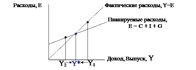 Кейнсианский крест показывает как доход Y определяется по уровню планируемых инвестиций I и фискальной политике G и T. Эту модель используют, чтобы показать как меняется доход когда одна из этих экзогенных переменных меняется. Фактические расходы – это количество, которое тратят домохозяйства, фирмы и государство на товары и услуги (GDP). Планируемые расходы – это количество, которое домохозяйства, фирмы и государство хотят потратить на товары и услуги. Экономика в равновесии когда: Фактические расходы = Планируемым расходам или Y=E