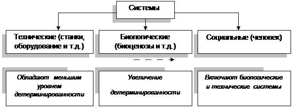 Классификация систем может быть проведена по различным признакам, однако основной является группировка их в трёх подсистемах: технической, биологической и социальной. Социальная система может включать биологическую и техническую подсистемы, а биологическая — техническую. Классификация систем приведена на рис. 4.1