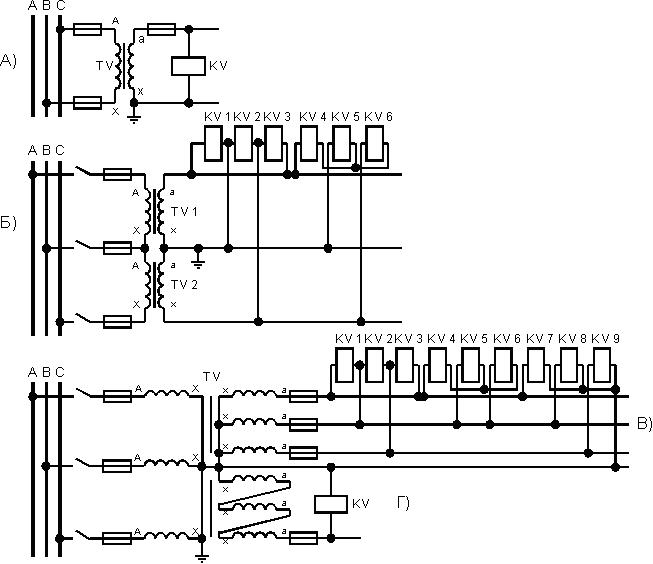 Рис. 16. Схемы соединения измерительным трансформаторов напряжения и обмоток реле