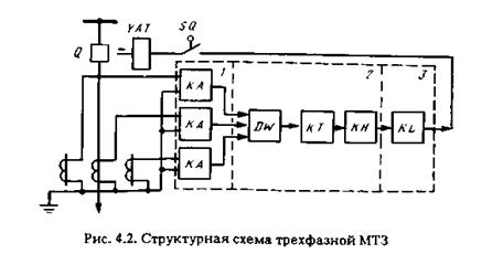 На рис.4.2 приведена структурная схема трехфазной МТЗ с независимой от тока выдержкой времени, характеризующая общие принципы выполнения МТЗ при любой используемой элементной базе.