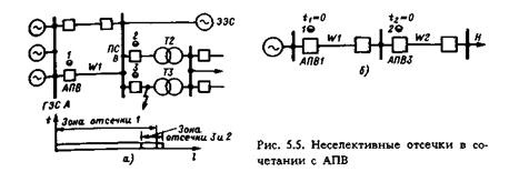 Неселективной отсечкой называется мгновенная отсечка, действующая при КЗ за пределами своей ЛЭП. Такая отсечка применяется для быстрого отключения КЗ в пределах всей защищаемой ЛЭП. Неселективное действие отсечки при КЗ вне ЛЭП исправляется при помощи АПВ, включающего обратно отключившуюся ЛЭП. Примеры применения неселективной отсечки приведены на рис.5.5.