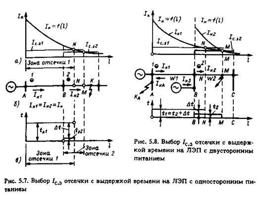 Мгновенная отсечка защищает только часть ЛЭП; чтобы выполнить РЗ всей ЛЭП с минимальным временем действия, применяется отсечка с выдержкой времени (см. рис.5.2, б). Зона и время действия такой отсечки 1 (рис.5.7, а, б)согласуются с зоной и временем действия мгновенной отсечки 2 так, чтобы была обеспечена селективность.