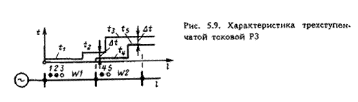 Сочетая МТЗ 1 с мгновенной отсечкой 3 иотсечкой с выдержкой времени 2, можно получить трехступенчатую МТЗ, обеспечивающую быстрое отключение повреждений на защищаемой линии W1 и резервирующую РЗ 4 и 5 следующего участка. Характеристика времени действия трехступенчатой МТЗ показана на рис.5.9.
