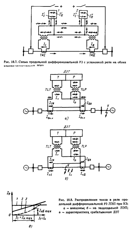 а) ток, поступающий от TAI и ТАII, распределяется между ближним и дальним реле обратно пропорционально сопротивлениям их цепей (рис.10.7). В контуре дальнего реле участвуют соединительные провода, а поэтому ток, направляющийся в дальнее реле, меньше, чем ток, поступающий в реле, расположенное вблизи данных ТТ. В результате этого токи, поступающие в реле, не балансируются, и поэтому при внешнем КЗ даже при работе ТТ без погрешностей в реле 1 появляется дополнительный ток небаланса