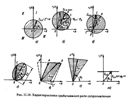 Характеристики срабатывания основных типов PC, изображенные на рис.11.14, представляют собой геометрическое место точек, удовлетворяющих условию Z p = Z c.p. Заштрихованная часть характеристики, где Z p ≤ Z c.p, соответствует области действия реле. При Z p, выходящих за пределы заштрихованной части, т.е. при Zp > Zc.p, реле не работает.