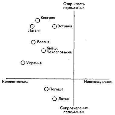 Другой пример социологического исследования институций — социокультурная типологизация стран Европы (в том числе России) по осям «открытость переменам / сопротивление переменам» и «коллективизм / индивидуализм»16. Страны Европы размещены в двумерном пространстве признаков, которое получено с помощью факторного анализа тридцати социокультурных индексов (рис. 3,1).