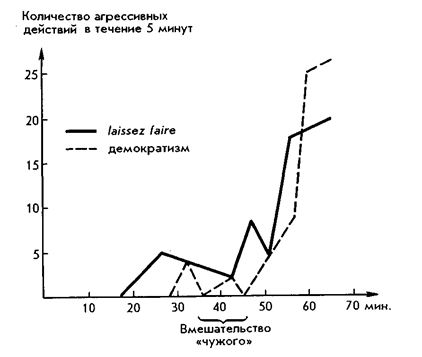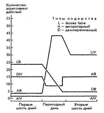 Эксперимент показал, что низкий уровень агрессивного поведения свойствен авторитарному типу лидерства. Зато освобождение от авторитарного лидерства и переход к «попустительству» и демократии вызывает резкое нарастание агрессии, уровень которой затем снижается. Переход от «попустительства» к демократии и авторитаризму снижает агрессию.