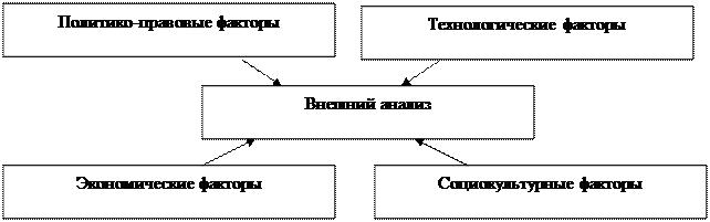 В виду того, что число возможных факторов макросреды достаточно велико, рекомендуется рассматривать четыре узловых направления, анализ которых получил название PEST – анализ (political-logal – политико-правовые, economic – экономические, sociocultural – социокультурные, technological forces – технологические факторы).