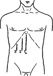 Рис. 12-1. Продольные лапаротомии. 1 —верхняя срединная, 2 — трансректальная (Лоусона), 3 — параректальная [Спасокукоцкого-Лахея). (Из: Двдерер Ю.М., Крылова Н.П. Атлас операций на печени. — М., 1975.)