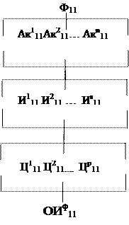 Процесс планирования в прямом направлении начинается с определения цели планирования и построения иерархии прямого процесса (рис.26). В вершине иерархии устанавливается фокус Ф11, который определяет логическое будущее (глобальную цель). Уровень 2 состоит из акторов, являющихся факторами внешней и внутренней среды. В уровень 3 включаются цели каждого актора. Уровень 4 содержит возможные сценарии, или исходы, за которые борется каждый актор, как результат реализации своих целей. Уровень 5 иерархии определяется как обобщенный сценарий (исход), который представляет своеобразный результат реализации всех этих сценариев. Этот сценарий называют также логическим исходом.