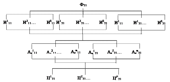 В вершине иерархии устанавливается фокус Ф21, отражающий желаемое будущее. В уровень 2 иерархии включаются желаемые исходы, которые хотят реализовать акторы. Эти исходы могут представлять следующие комбинации: 1 – желаемые исходы по числу и наименованию, соответствующие вероятным исходам из предыдущего прямого процесса и отличающиеся от последних приоритетом относительно их воздействия на желаемое будущее; 2 – генерируются новые желаемые исходы, не пересекающиеся с вероятными исходами предыдущего прямого процесса; 3 – множество желаемых исходов формируется на основе вероятных исходов из предыдущего процесса и вновь определенных на данном обратном процессе желаемых исходов.