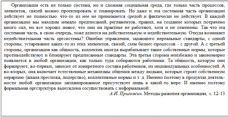 Организация есть своего рода микрообщество, в нем отражаются (хотя и не зеркально) чуть ли не все характеристики общественной жизни. Вместе организации формируют «мир организаций» (А. Пригожин), отличный от «мира природы» и «мира техники». И поэтому нельзя дать однозначной оценки организации с точки зрения материальности и духовности, объективности и субъективности, формальности и неформальности.