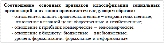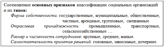 В литературе предлагаются типологии организаций с использованием различных признаков: взаимоотношение с внешней средой, тип организационной структуры, отношение к личности, организационно-правовые формы, отношение к собственности и др. [34]