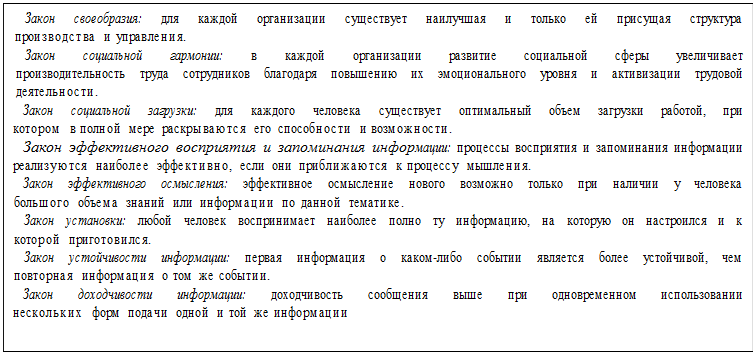 2) законы организации (устойчивые, проявляющиеся постоянно и необходимо связи и отношения, фиксируемые в виде общепринятых утверждений).