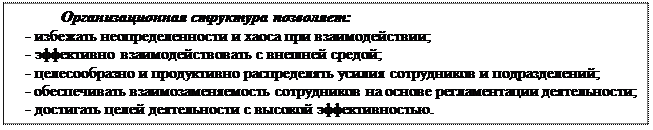 Организационная структура определяет задачи и ответственность работников, рабочие роли и взаимоотношения, а также коммуникации. Структура позволяет осуществлять управление и служит основой порядка и дисциплины, благодаря чему можно осуществлять организационную деятельность.