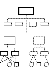 | Дивизиональная | Диверсификация деятельности организации (по продукту, клиентам, региону) с полной или частичной автономией (40-50 гг. ХХ в.) | - освобождение корпоративного руководства от оперативных функций; его концентрация на стратегии; - использование преимуществ рыночной специализации, эффективность в условиях динамичной внешней среды; - организационная гибкость; - более тесная связь производства с потребителями | -из-за большого количества уровней управленческой вертикали возможен разрыв стратегического и оперативно-тактического уровней управления; - затруднено согласование интересов организации и дивизионов, возможны центробежные тенденции; - плохое взаимодействие при решении вопросов, смежных для подразделений, снижение качества выполнения функциональных задач; - дублирование функций на разных уровнях и увеличение затрат на управление | ![]() ![]() ![]() ![]() ![]() ![]() ![]() |
