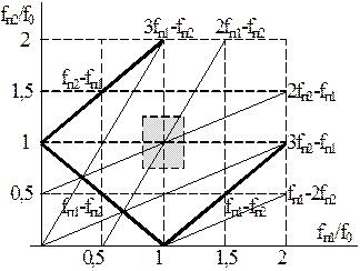 Характеристика частотной избирательности по интермодуляции (2-х сигнальной) – зависимость величины равных по амплитуде мешающих сигналов на входе приемника от частоты одного из них при заданном Кинт.