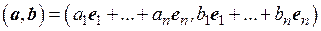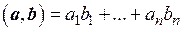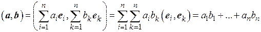 Пусть a и b – два произвольных вектора пространства Rn с ортонормированным базисом е 1,=(1,0,…,0),…, е n =(0,0,…,1). Обозначим координаты векторов a и b в базисе е 1,…, е n соответственно через a 1,…, a n и b 1,…, b n и найдем выражение скалярного произведения этих векторов через их координаты в данном базисе, т.е. предположим, что