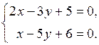 как нормальные векторы n 1 = (2,–3) и n 2 = (1,–5) этих прямых не коллинеарны. Точку пересечения прямых находим в результате решения системы