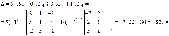 ○ Разложить определитель можно по любой строке или любому столбцу, согласно формуле (3.7). Однако если выбрать такую строку (или столбец), в которой больше элементов, равных нулю, то объем вычислений можно существенно уменьшить. В нашем случае наиболее подходящим является четвертый столбец. Разложение определителя по этому столбцу имеет вид
