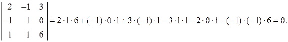 Пример. Доказать, что векторы a 1=(2;–1;3), a 2=(–1;1;0), a 3=(1;1;6) компланарны.