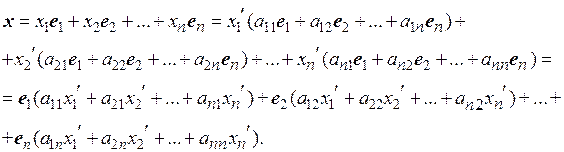 Найдем зависимость между координатами вектора в разных базисах. Пусть х – произвольный вектор рассматриваемого пространства Rn; (