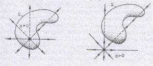 Если же заряд находится вне поверхности, то поток пересекает ее четное количество раз (два, четыре и т.д) так, что положительные и отрицательные (для тупых углов между n и Е) слагаемые уничтожают друг друга и общий поток оказывается равным нулю.