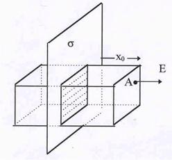 Рис.6. Поле от плоскости. | Пусть имеется плоскость, равномерно заряженная с поверхностною плотностью s.Требуется найти напря-женность электрического поля в точке, отстоящей от плоскости на расстояние х0. Для решения задачи про-ведем замкнутую поверхность через заданную точку А (см. рис.6).Поверхность имеет форму прямоуголь-ного параллелепипеда, боковые грани которого пер-пендикулярны заряженной плоскости. Выбор такой формы поверхности связан с тем, что вектор напря-женности электрического поля Е вблизи плоскости должен быть нормален к ней. Кроме того, наша вооб-ражаемая поверхность должна быть симметричной относительно заряженной плоскости. Полный поток через поверхность параллелпипеда складывается из |