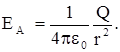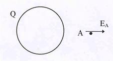 Рис.7. Поле от сферы. | В качестве второго примера рассмотрим поле от заря-женной сферы, полный заряд которой равен Q. Если точ-ка А (см. рис7), где требуется определить напряженность, находится вне заряженной сферы, то очевидно в качестве воображаемой поверхности выбрать сферу, концентри-ческую нашей заряженной сфере. В этом случае ЕА па-раллельно n, и Ф0 = ЕАS.Т.к.площадь сферы равна 4pR2, то из теоремы Гаусса нетрудно найти: |