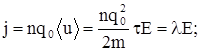 Для выяснения закономерностей постоянного тока обратимся к упрощенной микро-скопической картине. Рассмотрим отдельный заряд величиной q 0 , являющийся одним из носителей тока в проводнике (для металлов q0 = -е, где е – заряд электрона). В силу теплового движения каждый заряд движется хаотически, а под действием сторонних сил он приобретает еще и направленное движение. При хаотическом движении заряд постоянно сталкивается с ионами, масса и размеры которых значительно больше аналогичных пара-метров носителя. Ионы также участвуют в тепловом движении, но это, в основном, коле-бательные движения, амплитуда которых увеличивается с температурой. Носители, стал-киваясь с ионами, на какое – то мгновение как бы прлипают к последним (разноименные заряды стремятся притянуться друг к другу). На языке механики это означает, что носители испытывают неупругие столкновение с ионами так, что новый путь они начинают с нулевой скоростью направленного движения. Пусть время между двумя последовательными соударениями равно t. Тогда под действием напряженности носитель за это время приобретет скорость u =at. Ускорение а =F/m = q0 E/m; m – масса носителя. Вводя понятие плотности тока j, которое определяется как количество зарядов, проходящих через единичную площадку, перпендикулярную вектору скорости, можно записать: